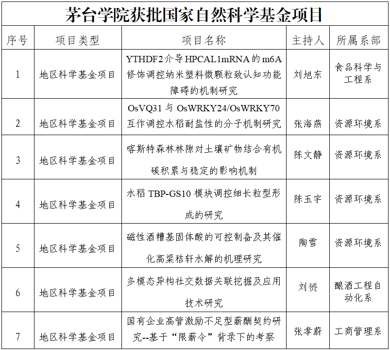 近日,国家自然科学基金委员会公布了2023年度国家自然科学基金项目的评审结果。根据评审结果显示,茅台学院获批7项国家自然科学基金,资助经费共计217万元。